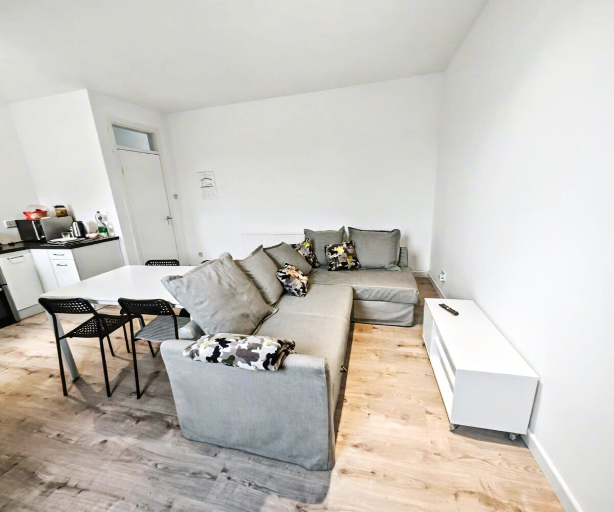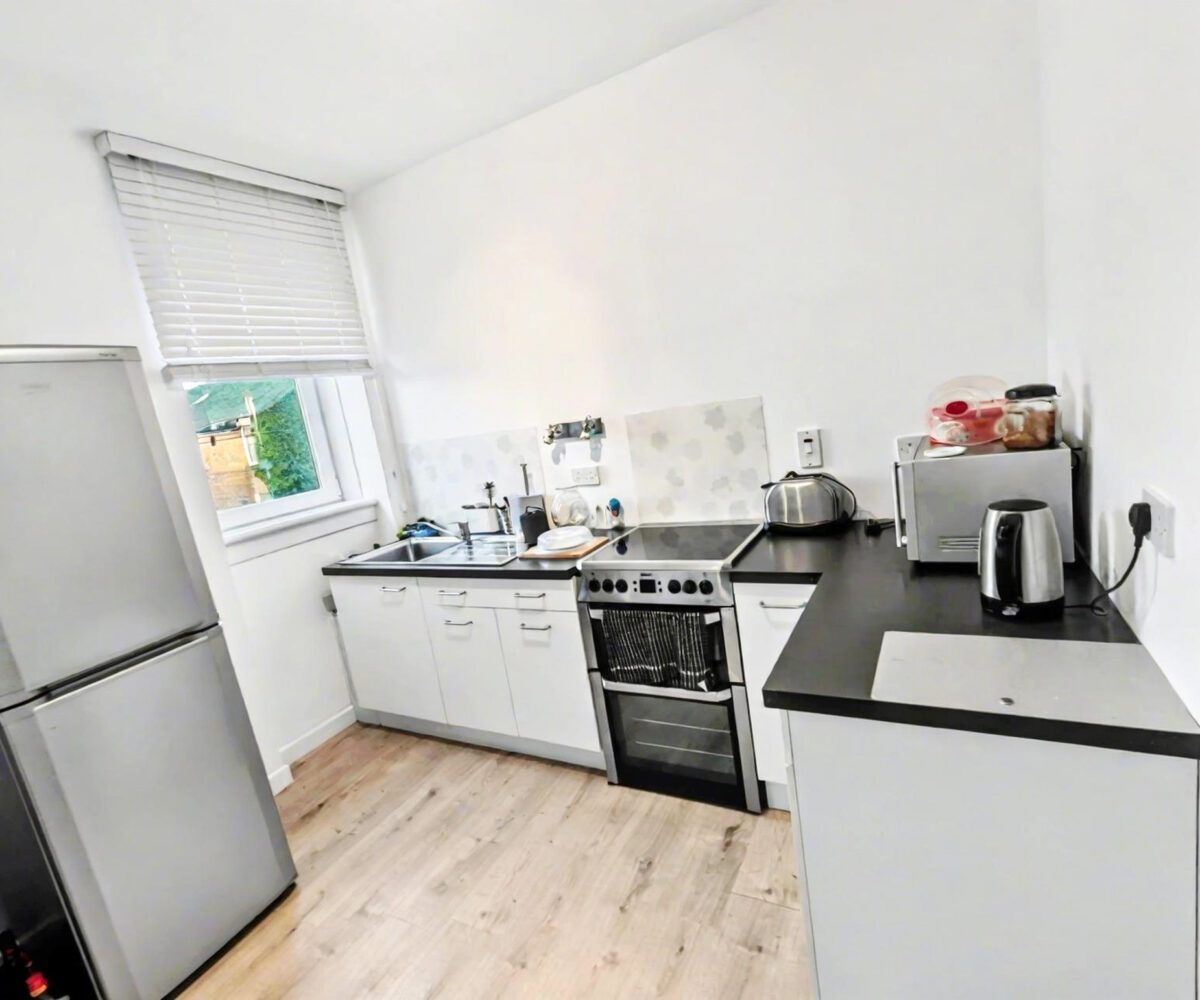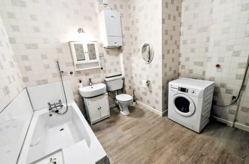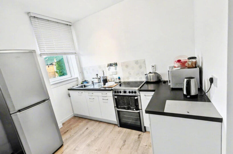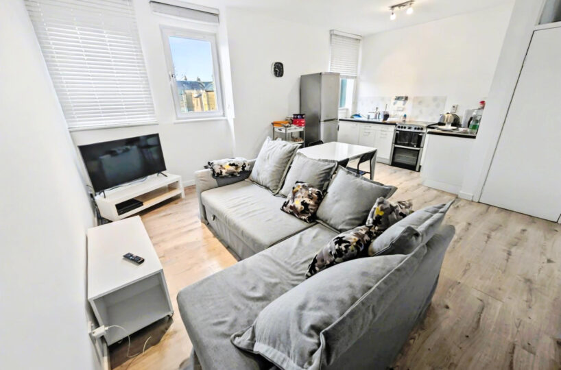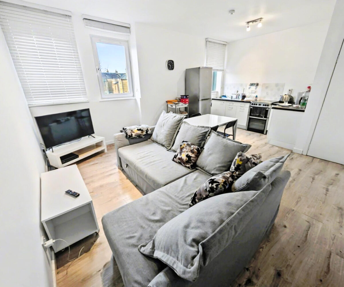 The flat has its own private entrance at the rear of the building, opening to a carpeted staircase to the first floor. The accommodation comprises a welcoming hallway, a bright open plan living room and kitchen with space for dining table and chairs, 2 generous double bedrooms and a bathroom which is large enough for new owners to create a 4 piece suite.