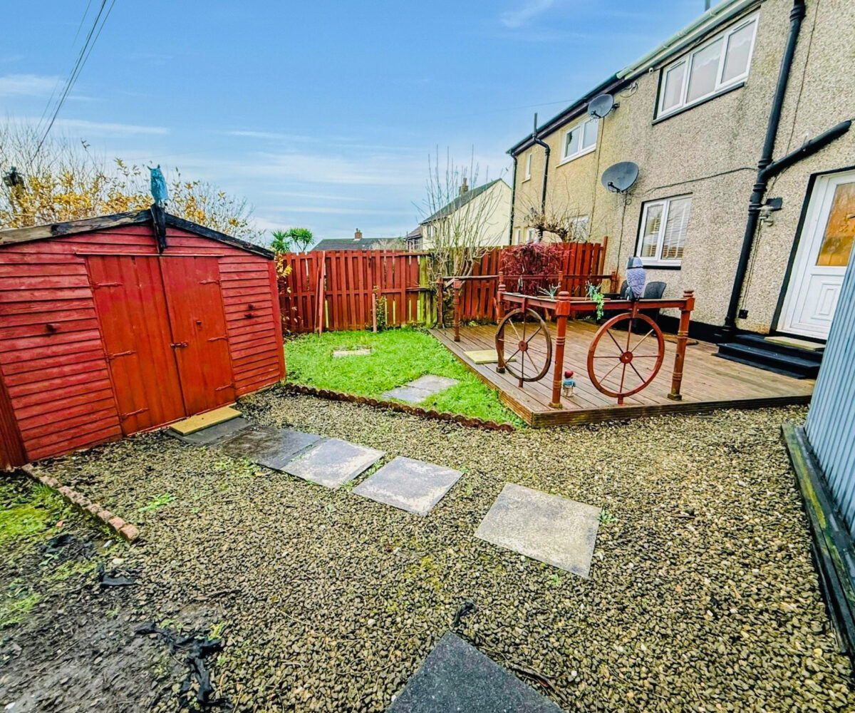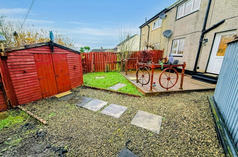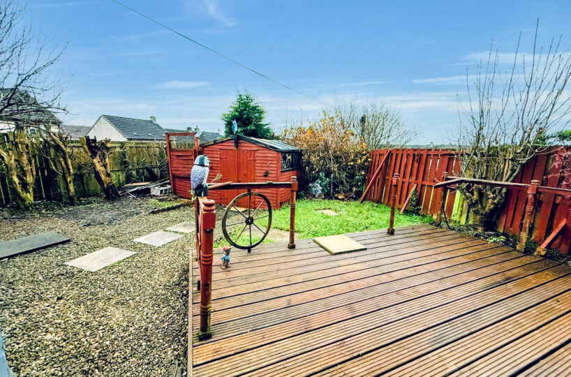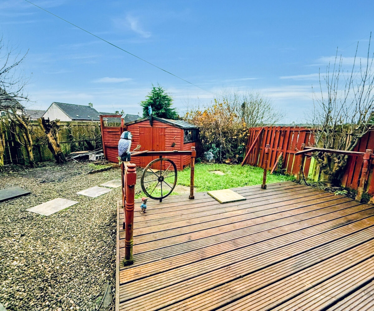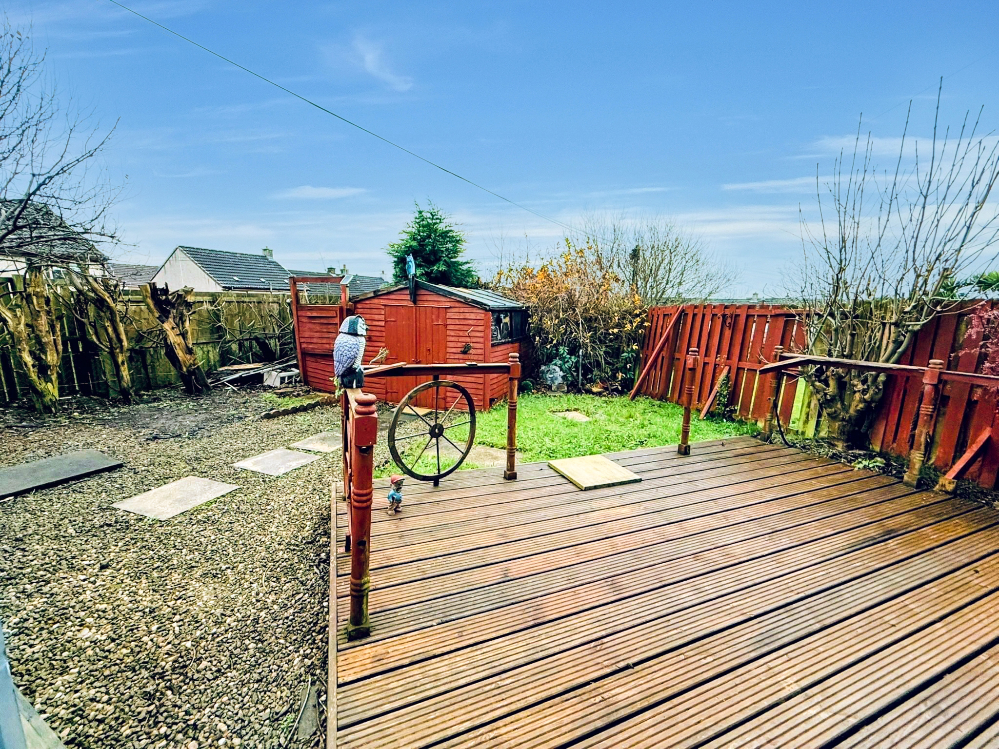 Externally the property has a large enclosed west facing rear garden which has a small decked patio area, a drying green and surrounding stone chippings There are also two small sheds and a well proportioned garage.