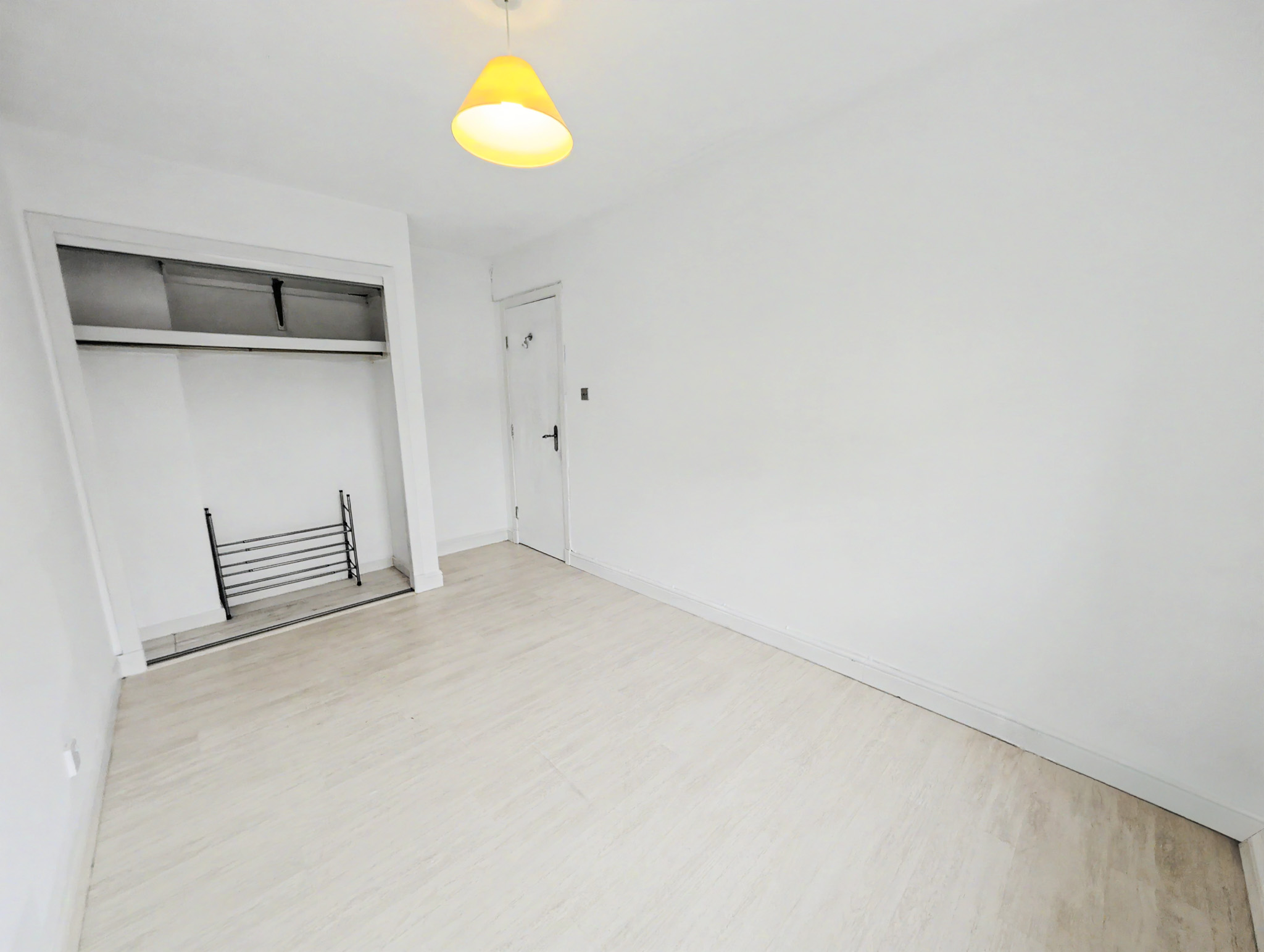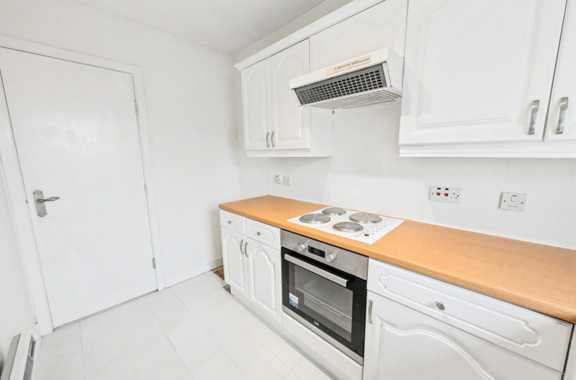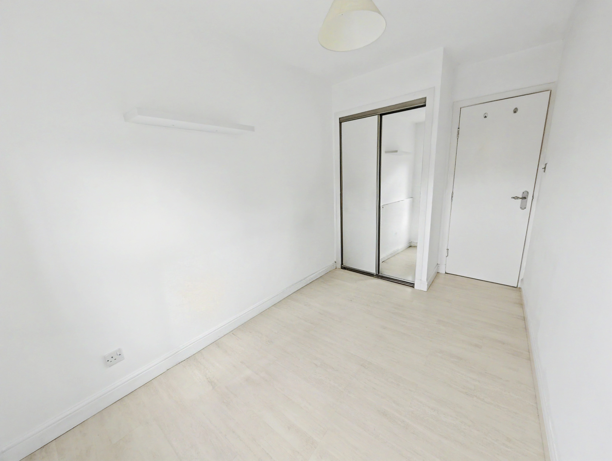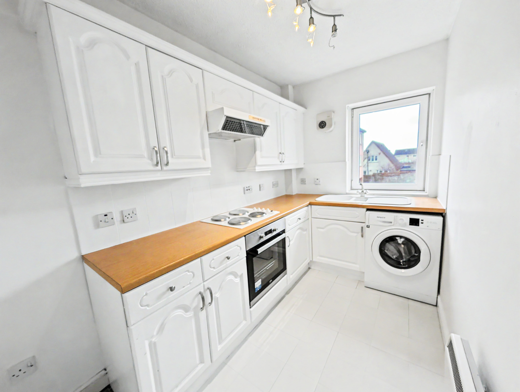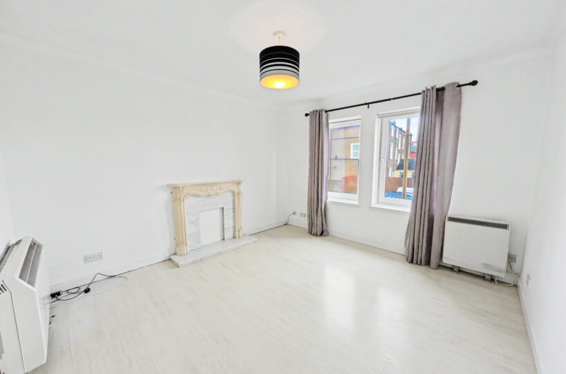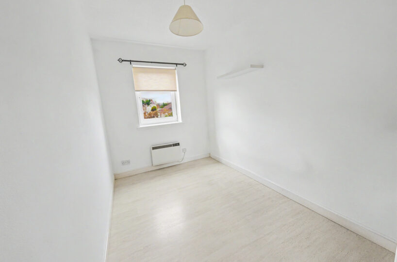 The accommodation on the first floor comprises a welcoming reception hallway with a cupboard for storage, a light filled living room, a modern kitted kitchen, two double bedrooms, both with integrated wardrobes, and completing the accommodation is a tiled bathroom with a white 3 piece suite.