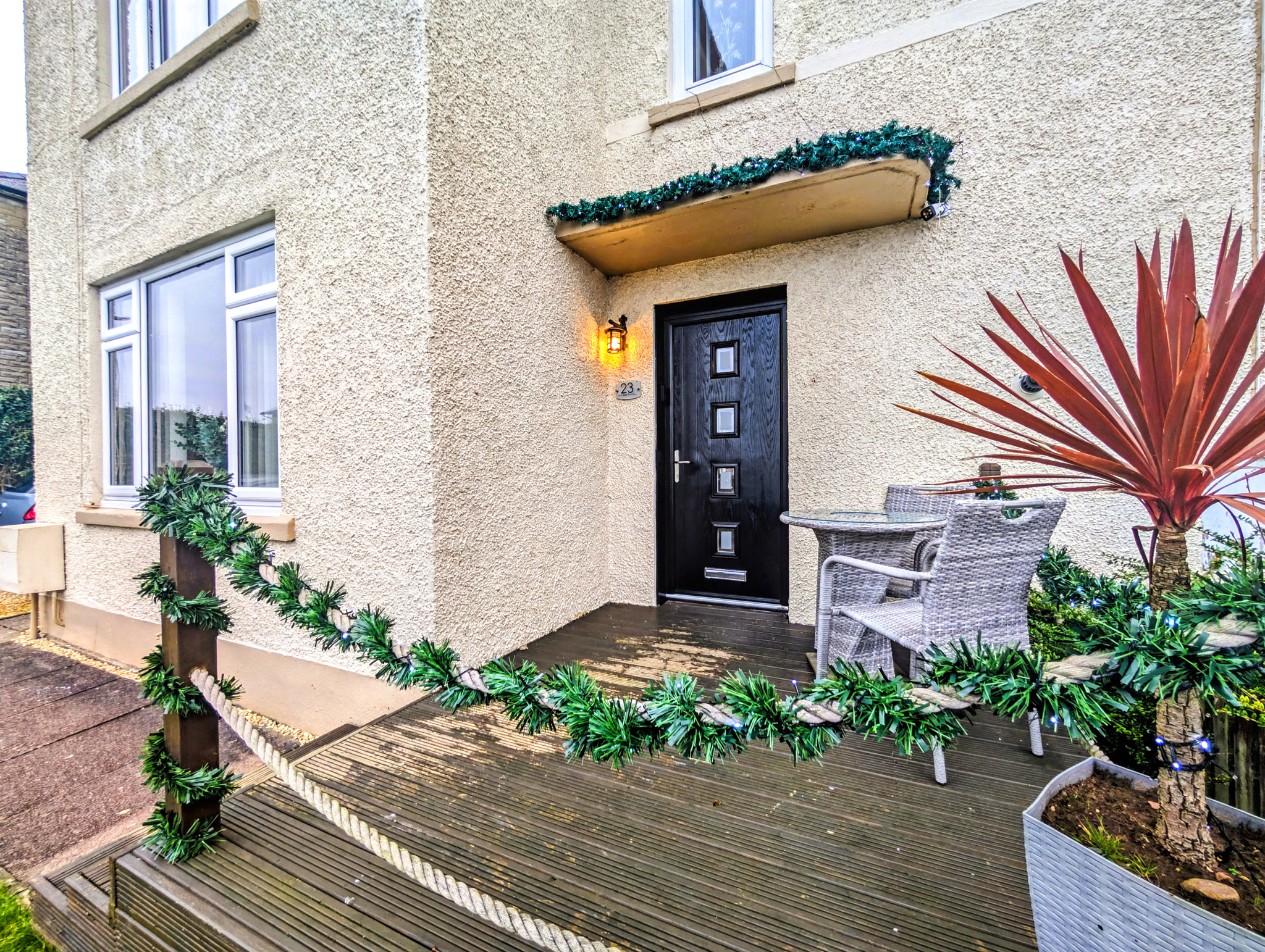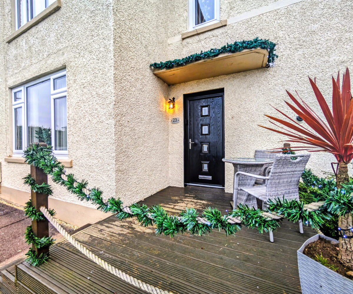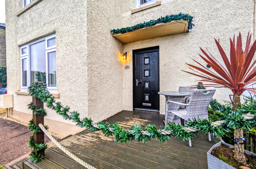 The front garden is laid to lawn with a decked seating area which enjoys the evening sun and there is a chipped driveway at the side of the property for two vehicles.