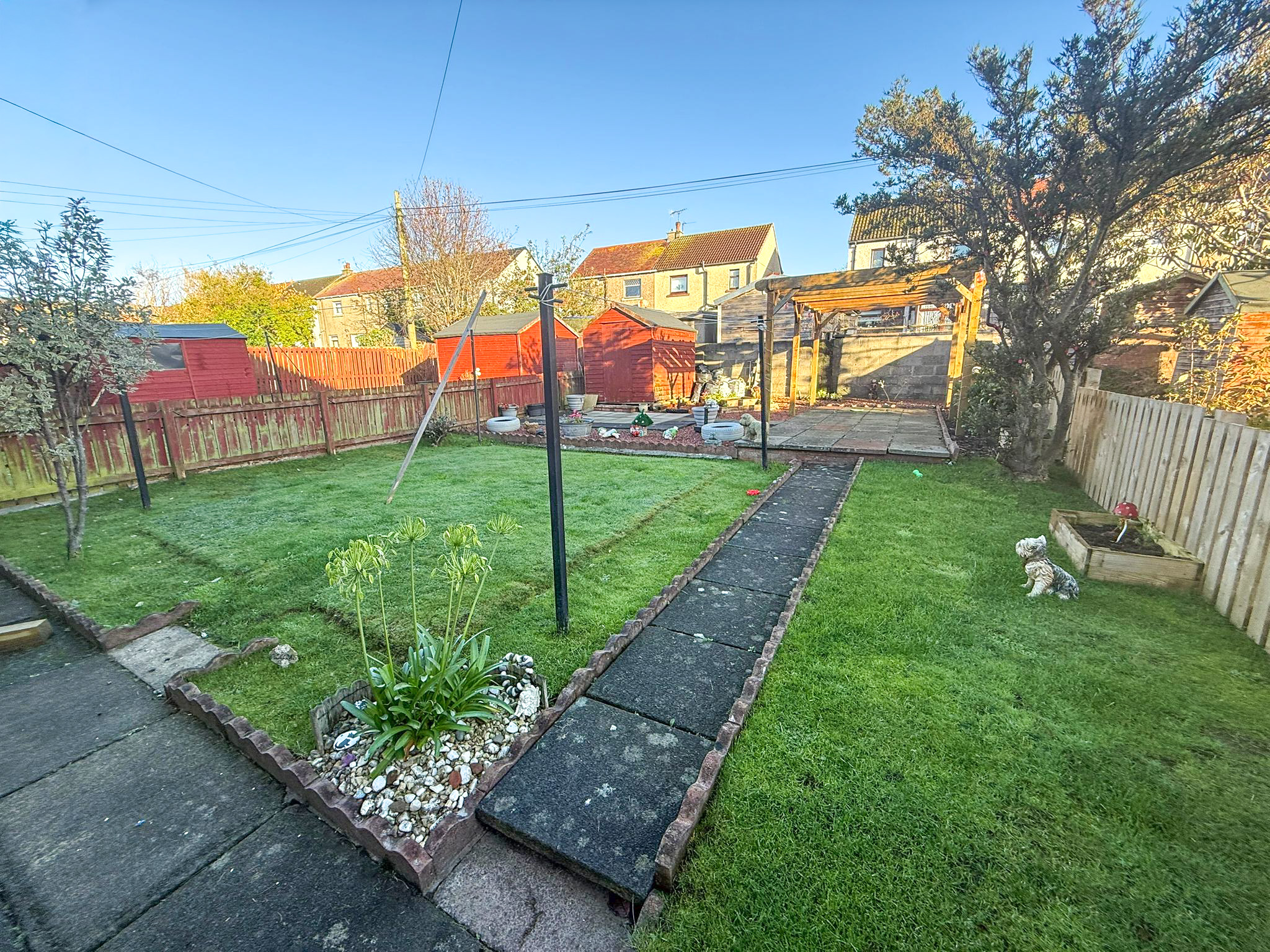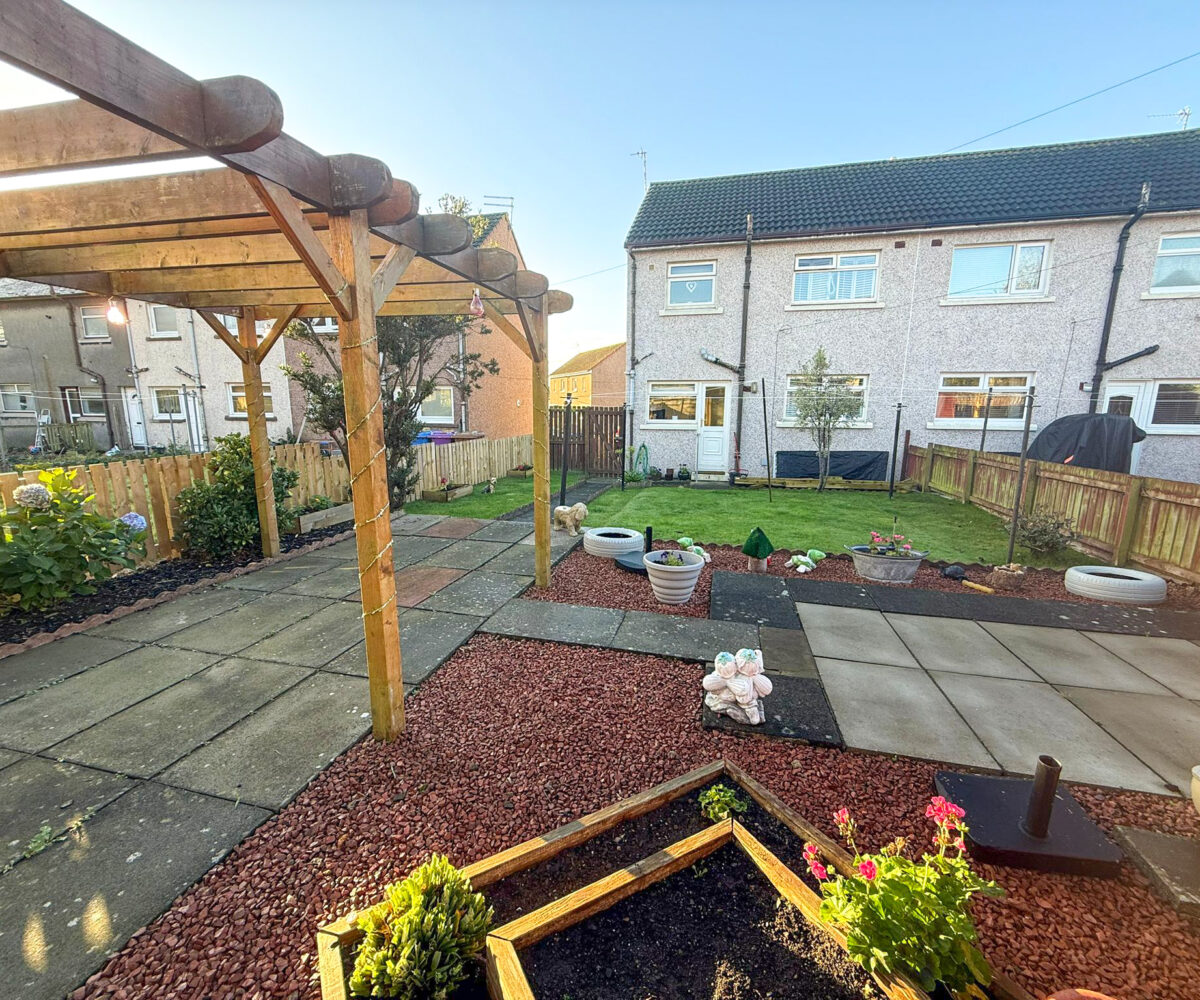 The property benefits from an enclosed garden at the front which is chipped for easy ongoing maintenance and a generous private rear garden which is laid to lawn with drying lines and has a paved seating area with a pergola, beds for plants and a timber shed.