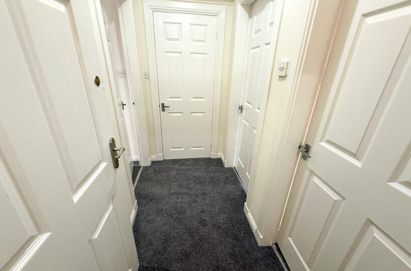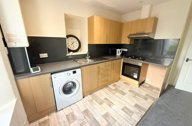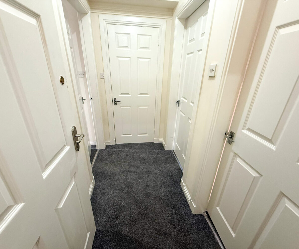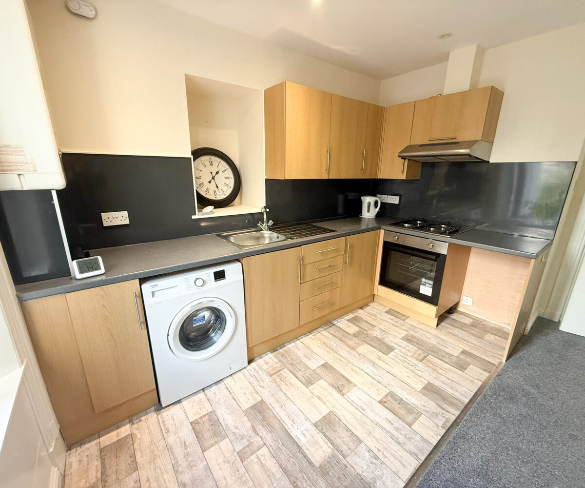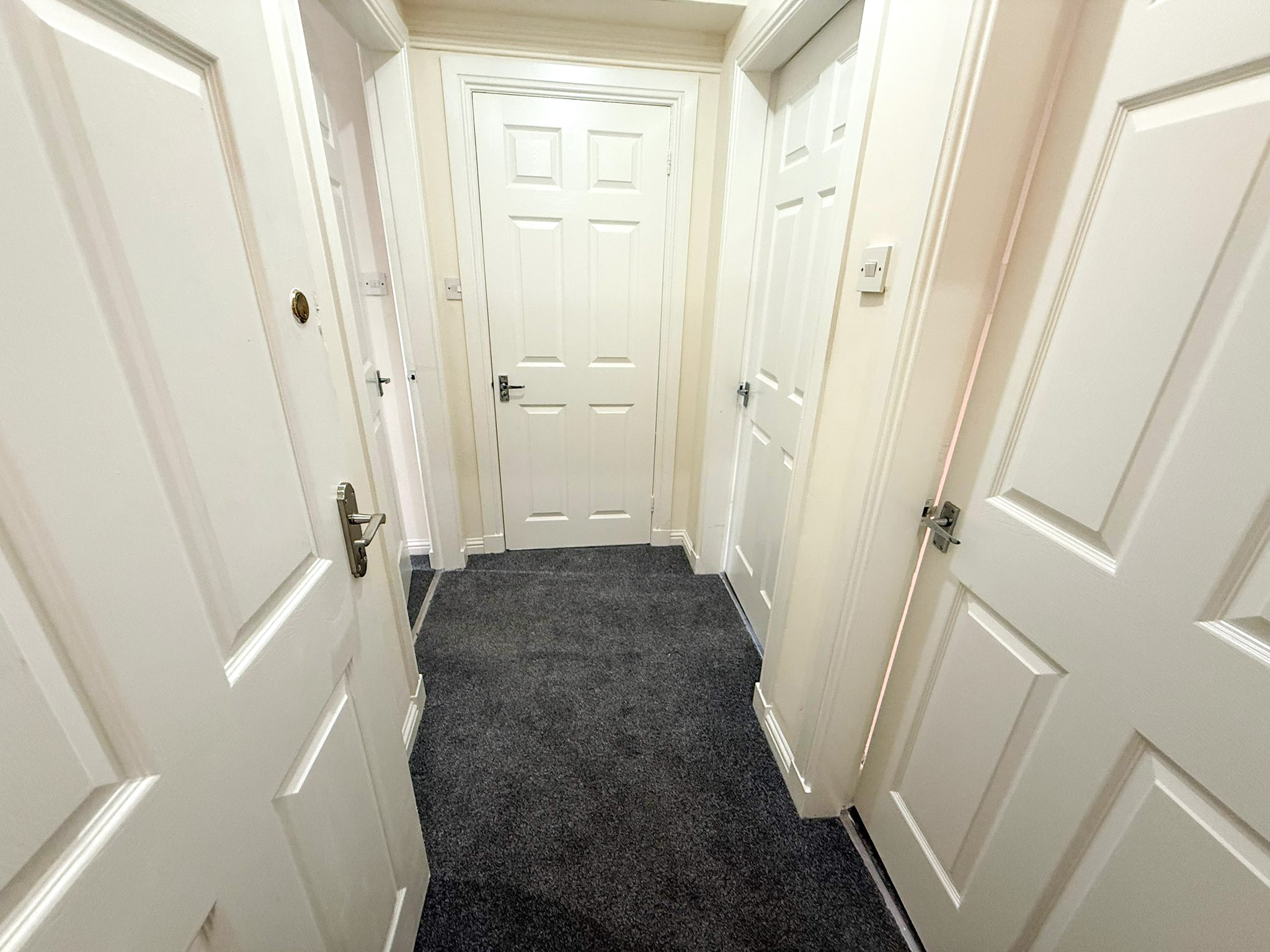 The accommodation comprises a welcoming entrance hallway, a bright open plan living room and kitchen with modern fitted base and wall units, integrated oven, hob and hood and space for appliances, 2 bedrooms and a wet-walled bathroom with white suite.