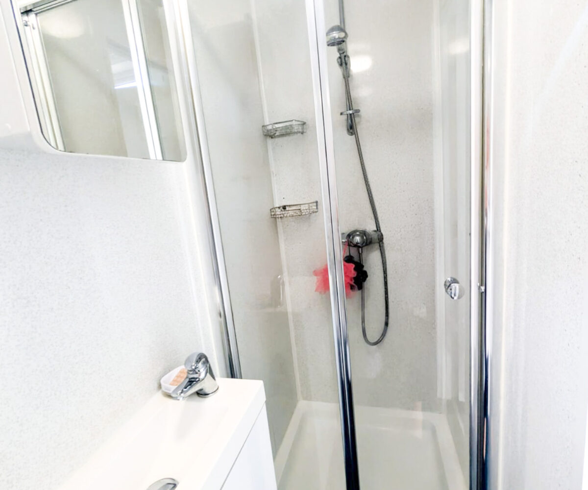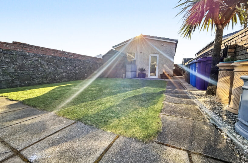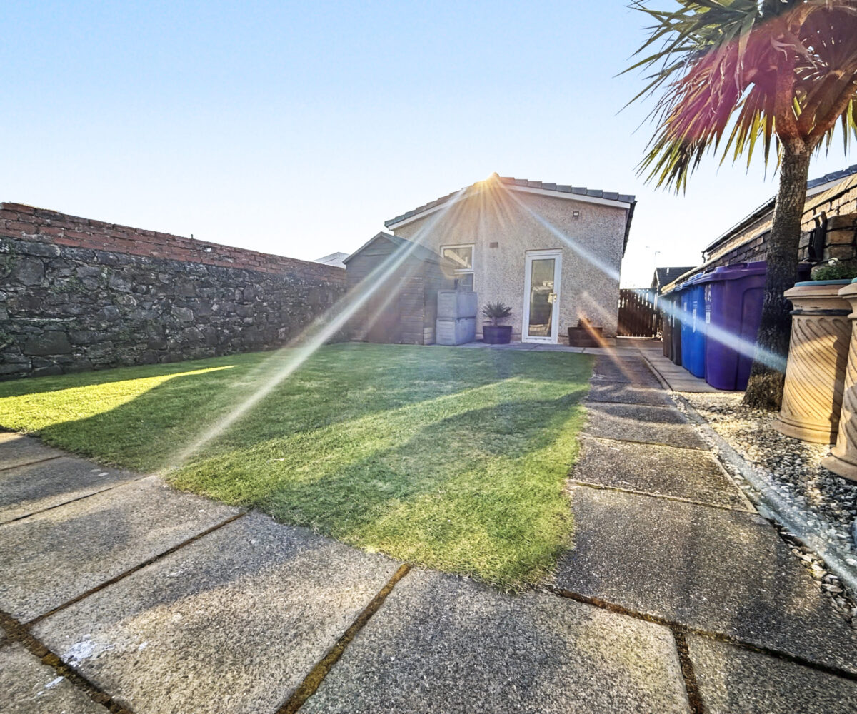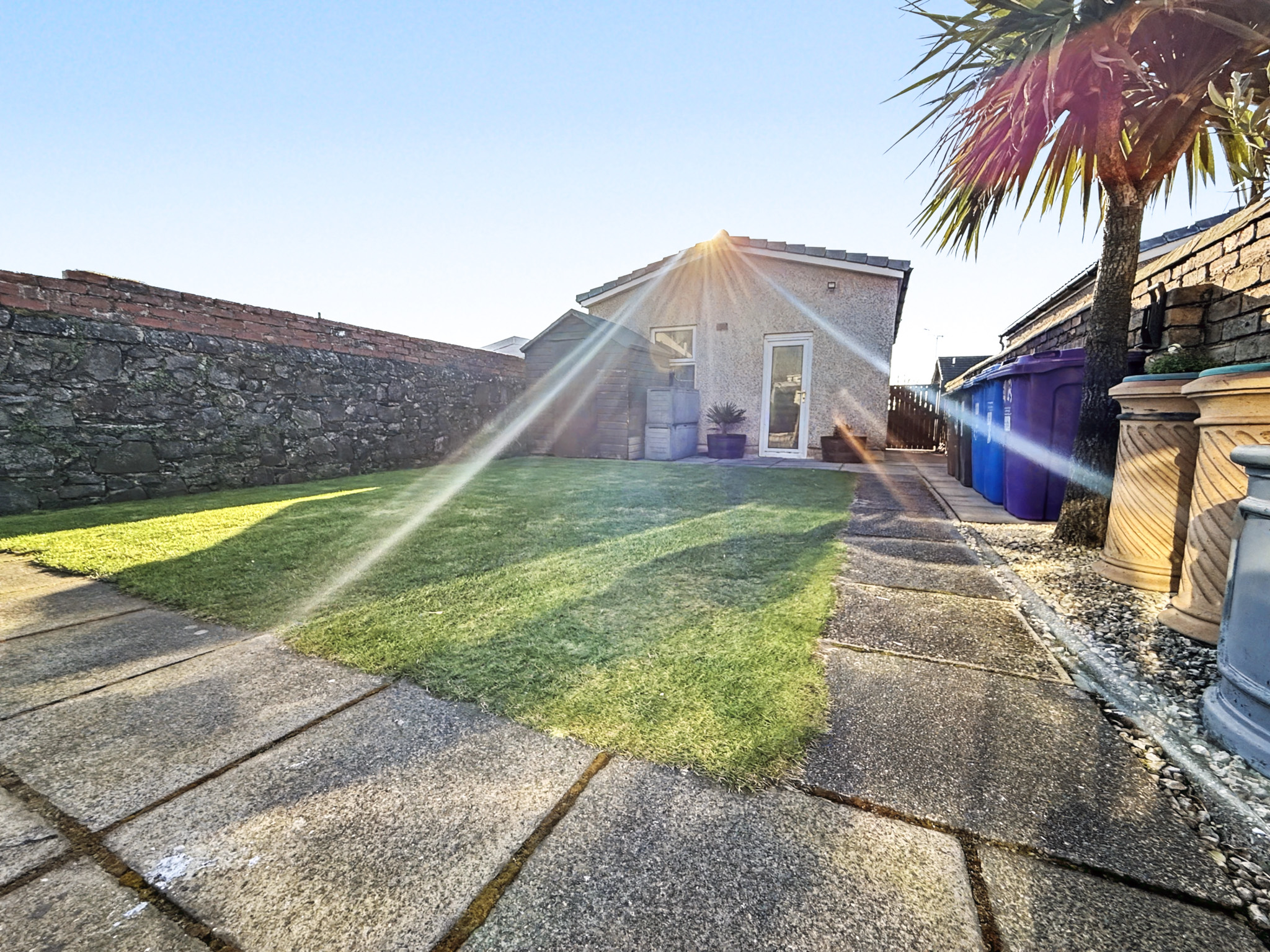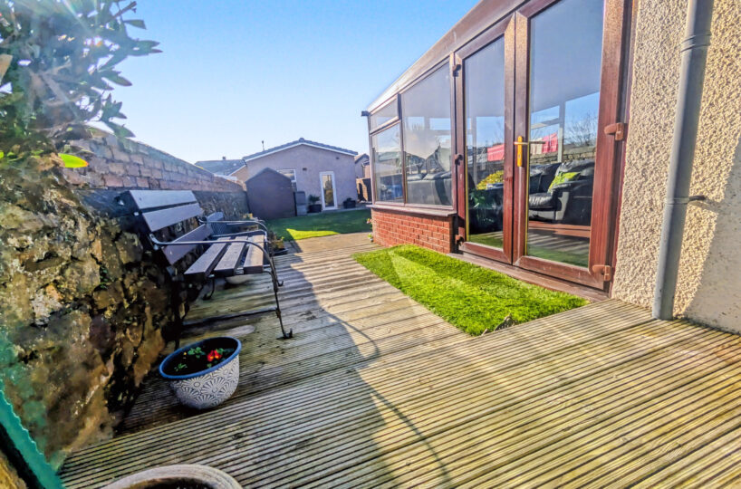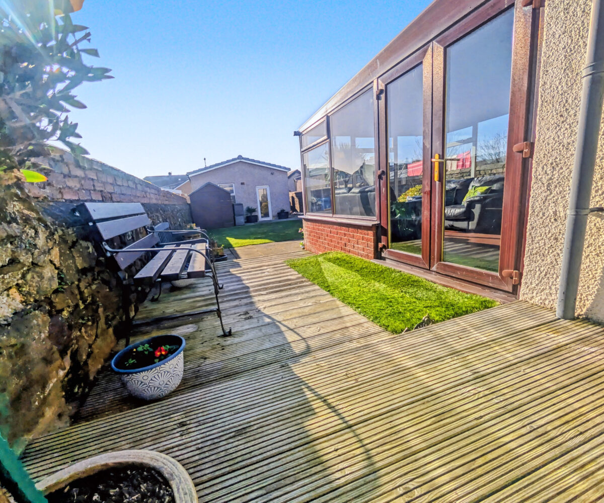 The property benefits from a generous south facing rear garden which has a well maintained lawn, a timber shed and a double garage accessible from a lane at the rear where there are 2 parking spaces. There is a decked seating area at the side of the property and the front garden is chipped for easy maintenance. Additionally there are 3 parking spaces at the front of the property.