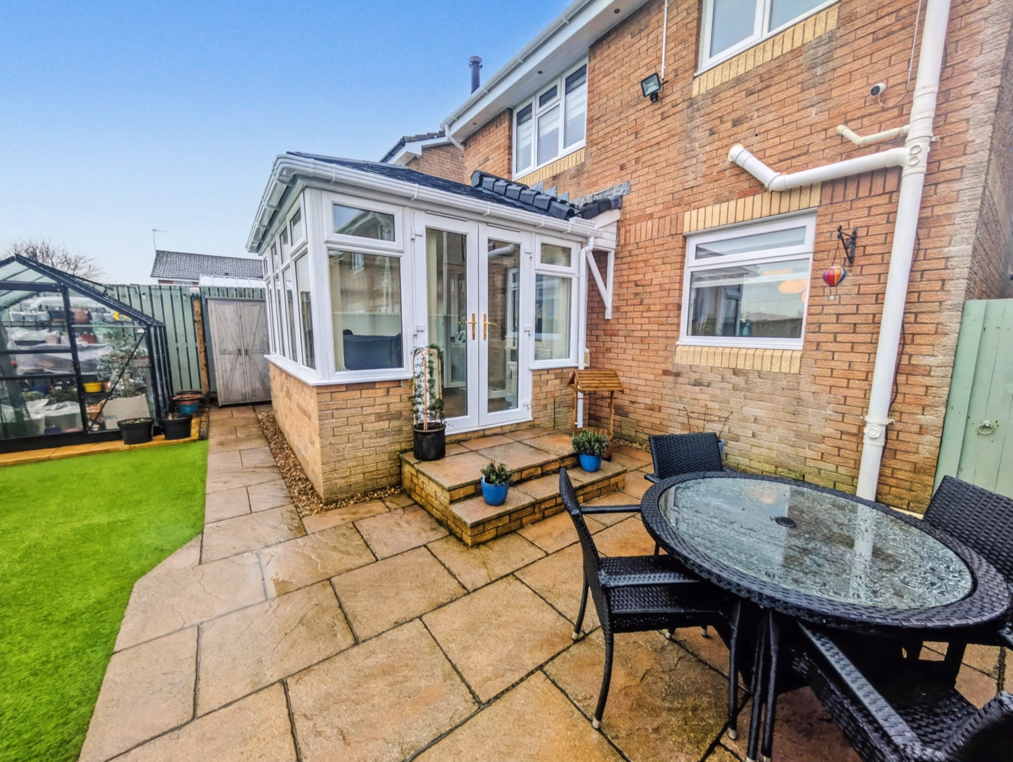 Externally the property benefits from a beautifully landscaped rear garden which is fully enclosed and enjoys a high degree of privacy. The garden has a paved patio, a bed for plants, an artificial lawn and a green house and with its tranquil backdrop is the perfect outdoor space to relax and unwind.
